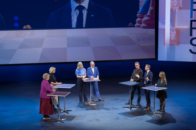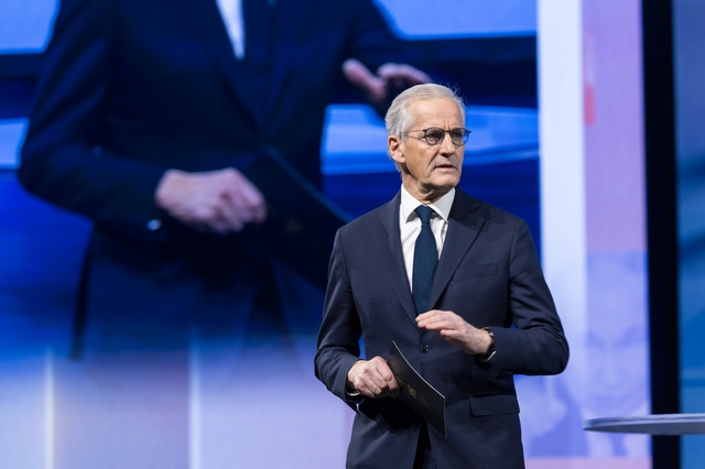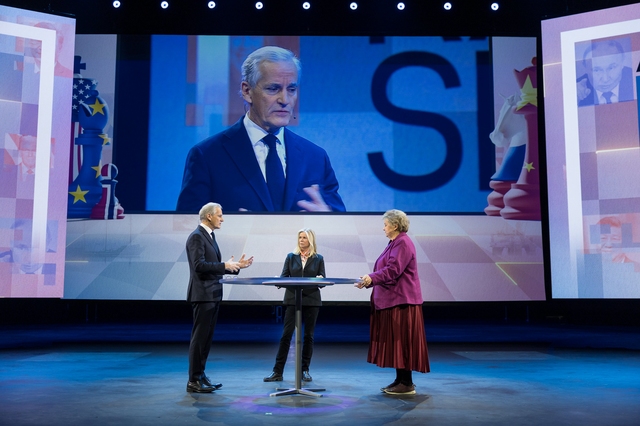 Norge som geopolitisk brikke: Irene Rummelhoff (Equinor), Erna Solberg (Høyre), Bent Skjærstad (TV 2), Knut Arild Hareide (Norges Rederiforbund) og Frøya Skjold Sjursæther (MDG). Foto: Eivind Senneset
