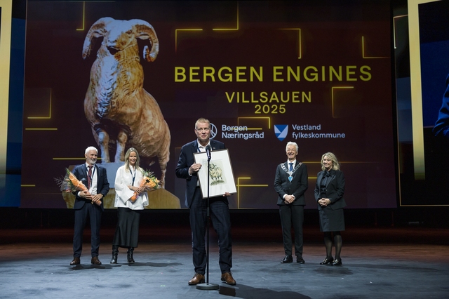 Villsauen: Bergen Engines ble tildelt Internasjonaliseringsprisen Villsauen for 2025. Monica Mæland (Bergen Næringsråd) og Jon Askeland (Vestland fylkeskommune).Foto: Eivind Senneset