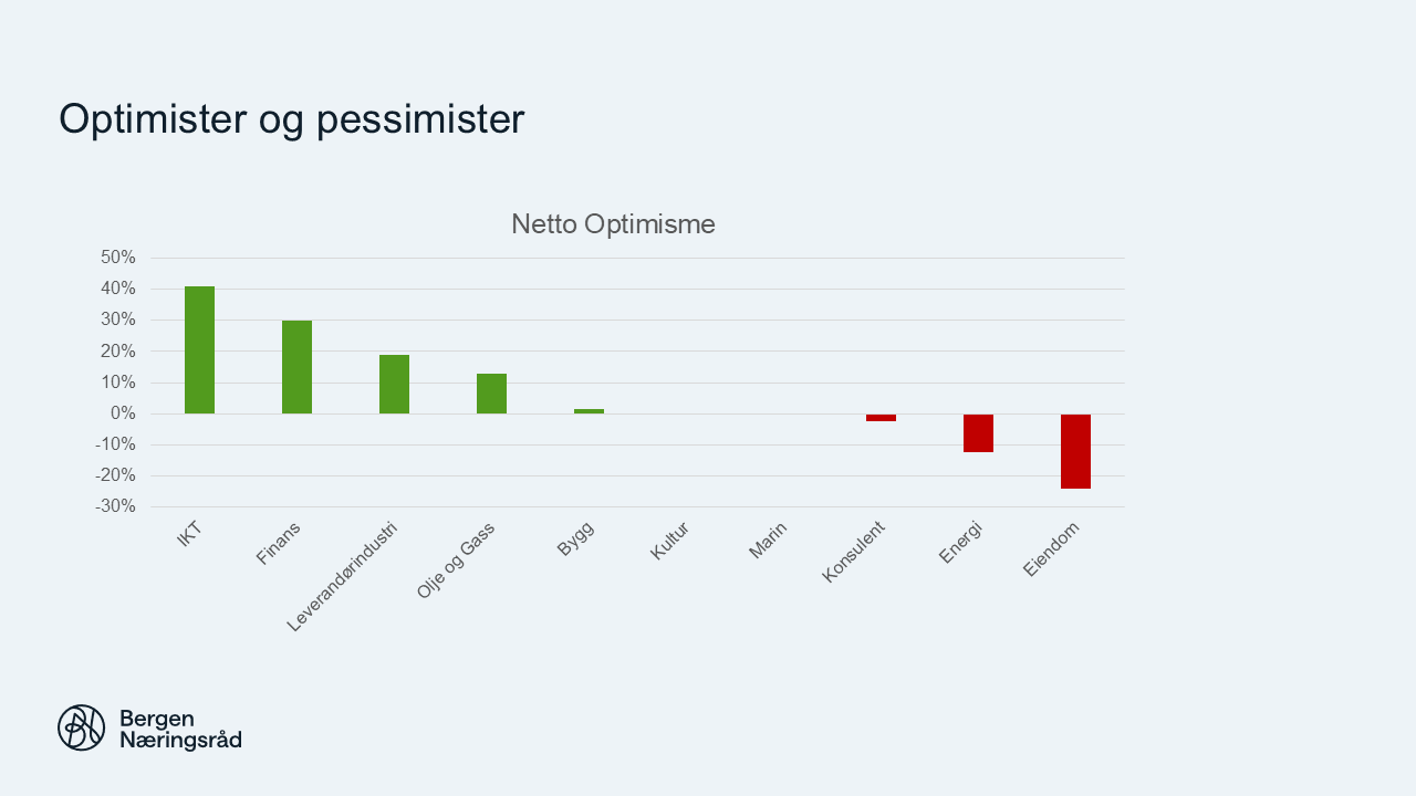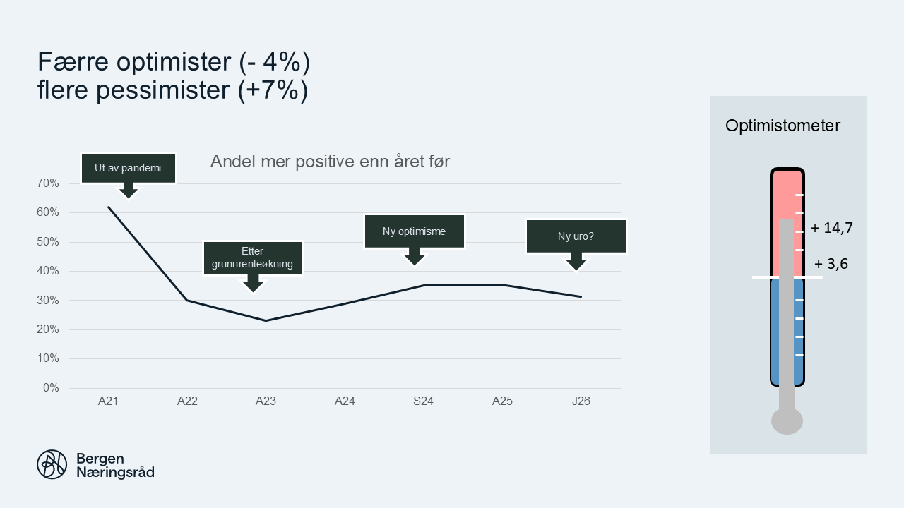 Bergen Næringsråds optimist-o-meter viser 3,6 prosent flere optimister enn pessimister.