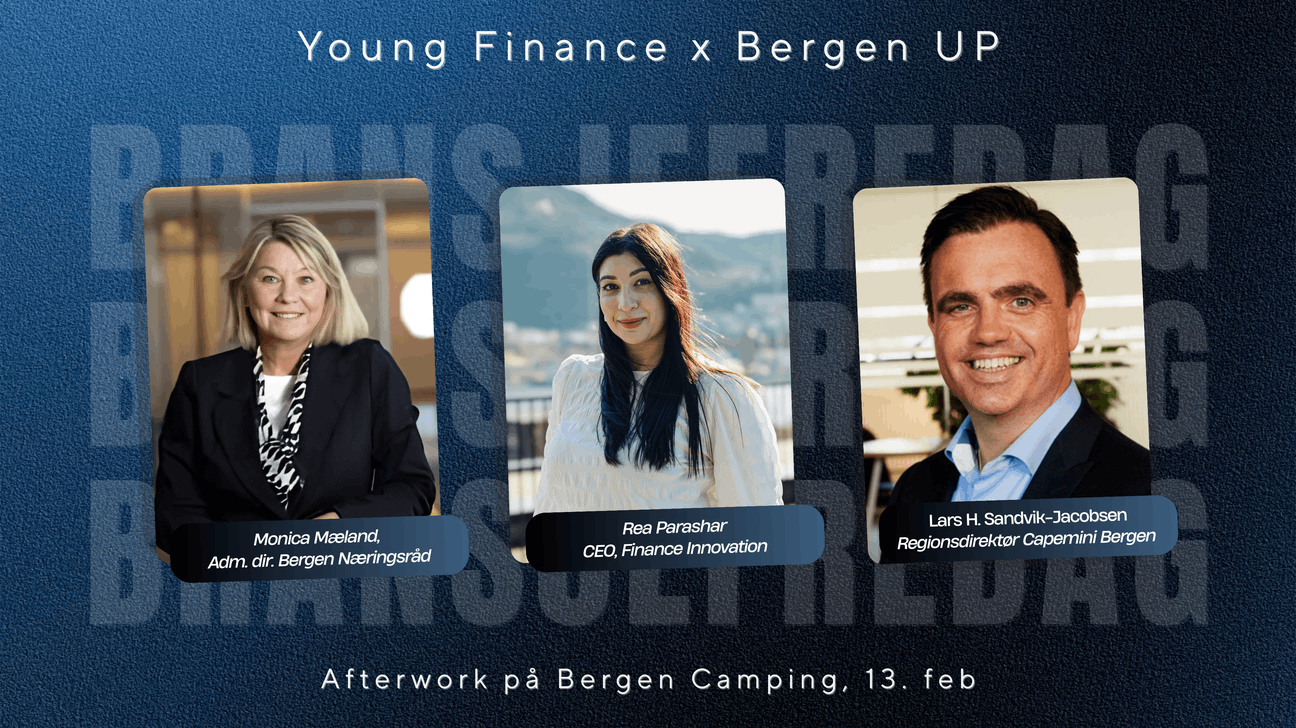 🎤 Lettbent faglig opplegg 18.00–19.00. Vi hører fra Monica Mæland, Rea Parashar i Finance Innovation og Regionsdirektør for Capemini Bergen Lars Helge Sandvik-Jacobsen.
